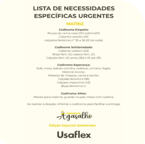 Realizamos mais uma edição da tradicional Campanha do Agasalho da Usaflex, que visa auxiliar primeiramente os colaboradores que possuem necessidade, por meio da arrecadação e posterior doação aos cadastros realizados com a Assistente Social, de itens de necessidade como roupas quentinhas e em bom estado de conservação, desde bebês, crianças até adultos, como também cobertas, mantas e tudo aquilo que nos mantém aquecidos na estação mais fria do ano.